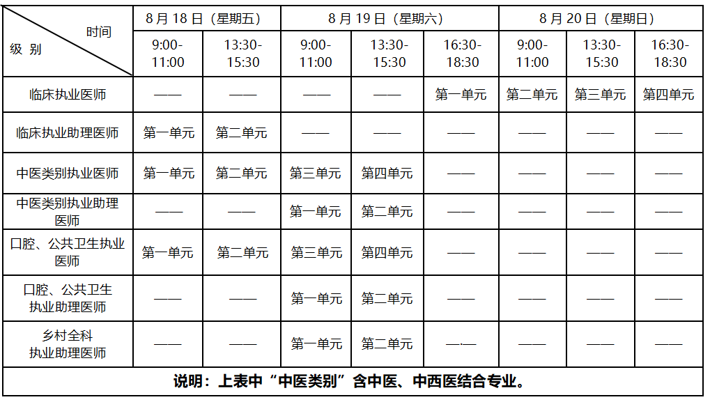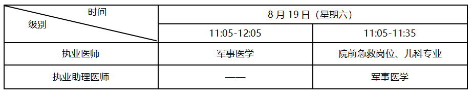 考試實行計算機化考試。軍隊現(xiàn)役人員加試軍事醫(yī)學,院前急救崗位和兒科專業(yè)加試相應內容。執(zhí)業(yè)醫(yī)師合格分數(shù)線為360分,執(zhí)業(yè)助理醫(yī)師合格分數(shù)線為180分??荚嚂r間如下: