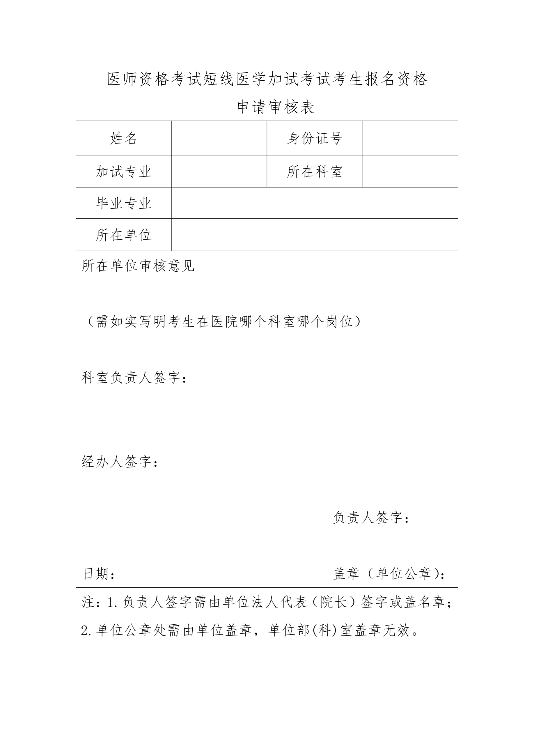 煙臺市衛(wèi)生健康委員會關(guān)于“2023年醫(yī)師資格考試報名材料審核的通知”醫(yī)學教育網(wǎng)小編專門整理了2023年山東煙臺考點醫(yī)師資格考試短線醫(yī)學加試考試考生報名資格申請審核表word版具體如下: