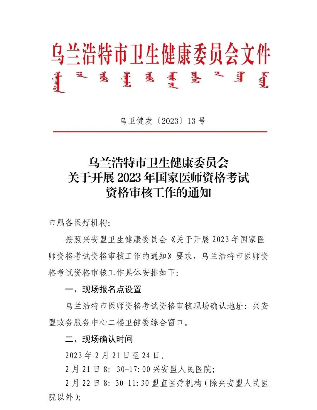 烏蘭浩特市2023年國(guó)家醫(yī)師資格考試資格審核工作將于2月21日至24日在興安盟政務(wù)服務(wù)中心二樓衛(wèi)健委綜合窗口進(jìn)行。各位考生,我們準(zhǔn)備好啦!