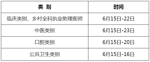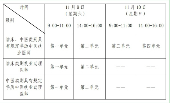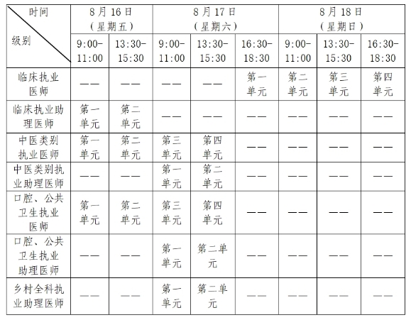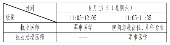 考試實行計算機化考試,軍隊現(xiàn)役人員加試軍事醫(yī)學,院前急救崗位和兒科專業(yè)加試相應內(nèi)容。執(zhí)業(yè)醫(yī)師合格分數(shù)線為360分,執(zhí)業(yè)助理醫(yī)師合格分數(shù)線為180分。全國統(tǒng)一考試時間如下:
