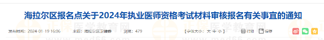 內(nèi)蒙古海拉爾區(qū)考點2024醫(yī)師資格考試材料審核報名有關(guān)事宜的通知