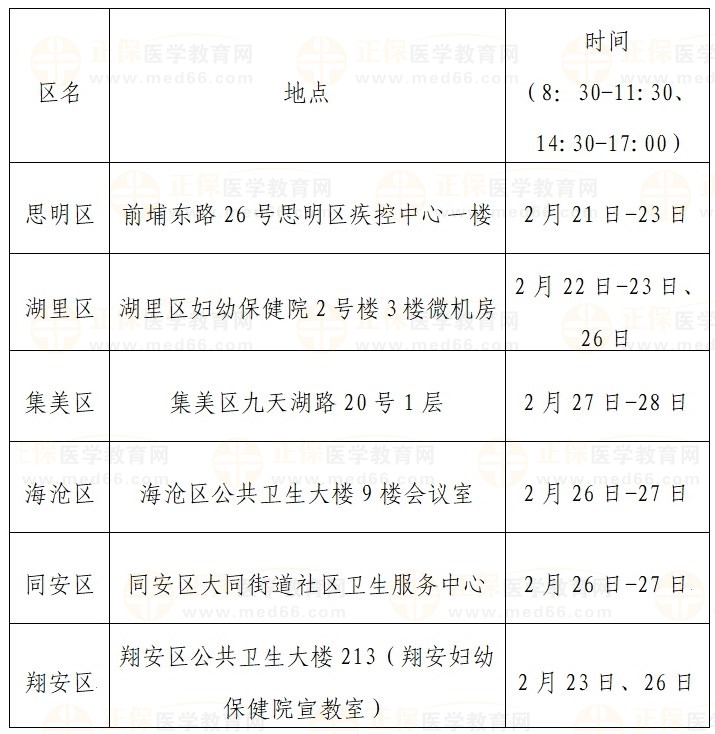 各區(qū)負(fù)責(zé)本轄區(qū)內(nèi)(上述20家市屬市管除外)執(zhí)業(yè)登記或備案的醫(yī)療機(jī)構(gòu)的考生現(xiàn)場(chǎng)資格審核,具體審核時(shí)間及地點(diǎn)見(jiàn)下表: