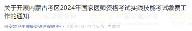 內(nèi)蒙古興安盟考點(diǎn)轉(zhuǎn)發(fā)2024年國(guó)家醫(yī)師資格考試內(nèi)蒙古考區(qū)實(shí)踐技能考試?yán)U費(fèi)工作的通知,請(qǐng)相關(guān)考生及時(shí)查看。未按時(shí)繳費(fèi)的考生視為放棄報(bào)名資格!逾期不能補(bǔ)報(bào)!