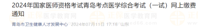 山東青島考點2024年醫(yī)師資格醫(yī)學綜合考試(一試)網上繳費通知