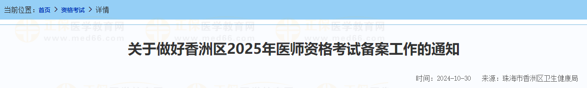 根據(jù)醫(yī)師資格考試廣東省考區(qū)辦公室《關(guān)于做好2025年醫(yī)師資格考試備案工作的通知》(粵醫(yī)考辦〔2024〕30號(hào))、珠海市衛(wèi)生健康局《關(guān)于做好2025年醫(yī)師資格考試備案工作的通知》文件精神,為做好2025年珠海市香洲區(qū)考點(diǎn)醫(yī)師資格考試備案工作,現(xiàn)將有關(guān)工作通知如下: