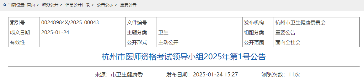 根據(jù)國家衛(wèi)生健康委醫(yī)師資格考試委員會2025年第1號公告及浙江省醫(yī)師資格考試領導小組2025年第27號公告的規(guī)定,現(xiàn)將我市2025年醫(yī)師資格考試工作的有關事項公告如下: