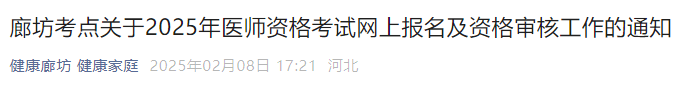 根據(jù)《國家衛(wèi)生健康委員會醫(yī)師資格考試委員會公告》(2025年第1號)和《河北考區(qū)關于開展2025年醫(yī)師資格考試網上報名及資格審核工作的通知》(冀醫(yī)考辦〔2025〕第1號)要求,結合我市實際,現(xiàn)就做好廊坊考點2025年醫(yī)師資格考試網上報名及資格審核確認工作有關事項通知如下: