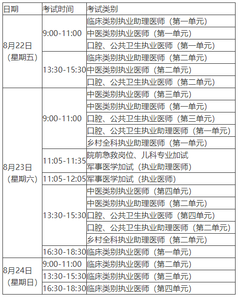 2025年繼續(xù)開展醫(yī)師資格考試臨床類別、中醫(yī)類別具有規(guī)定學歷中醫(yī)醫(yī)學綜合考試“一年兩試”試點。在安徽考區(qū)已報考當年醫(yī)師資格考試,實踐技能考試合格成績在有效期內(nèi),未通過第一次醫(yī)學綜合考試且無違紀違規(guī)行為的考生,和第一次醫(yī)學綜合考試缺考及未繳納考試費的考生,可報名參加第二次醫(yī)學綜合考試,考試時間如下:
