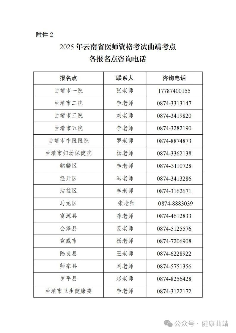 附件2.2025年云南省醫(yī)師資格考試曲靖考點(diǎn)各報(bào)名點(diǎn)咨詢電話