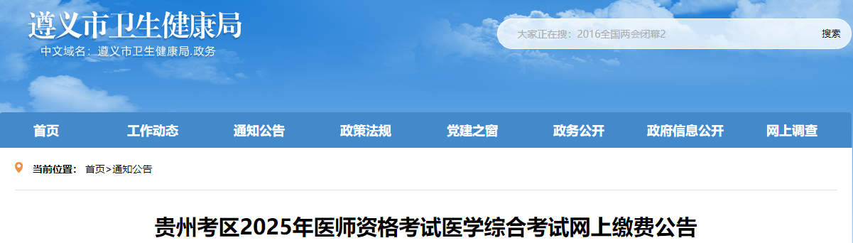 2025年全國醫(yī)師資格考試醫(yī)學(xué)綜合考試貴州考區(qū)網(wǎng)上繳費自公告之日起開通?,F(xiàn)就有關(guān)事項公告如下:
