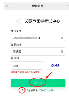 2、輸入身份證號(hào)、姓名、驗(yàn)證碼,勾選下方《用戶隱私政策》,點(diǎn)擊“下一步”。如下圖。他人代繳,請(qǐng)輸入?yún)⒓涌荚嚨目忌救诵畔?/span>