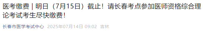 官方提醒:吉林長(zhǎng)春2025年醫(yī)師資格綜合筆試?yán)U費(fèi)7月15日截止!