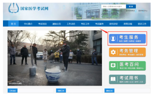第一步:考生通過國家醫(yī)學考試網(wǎng)(www.nmec.org.cn)——選擇“考生服務”,進入“國家醫(yī)學考試考生服務系統(tǒng)”操作。