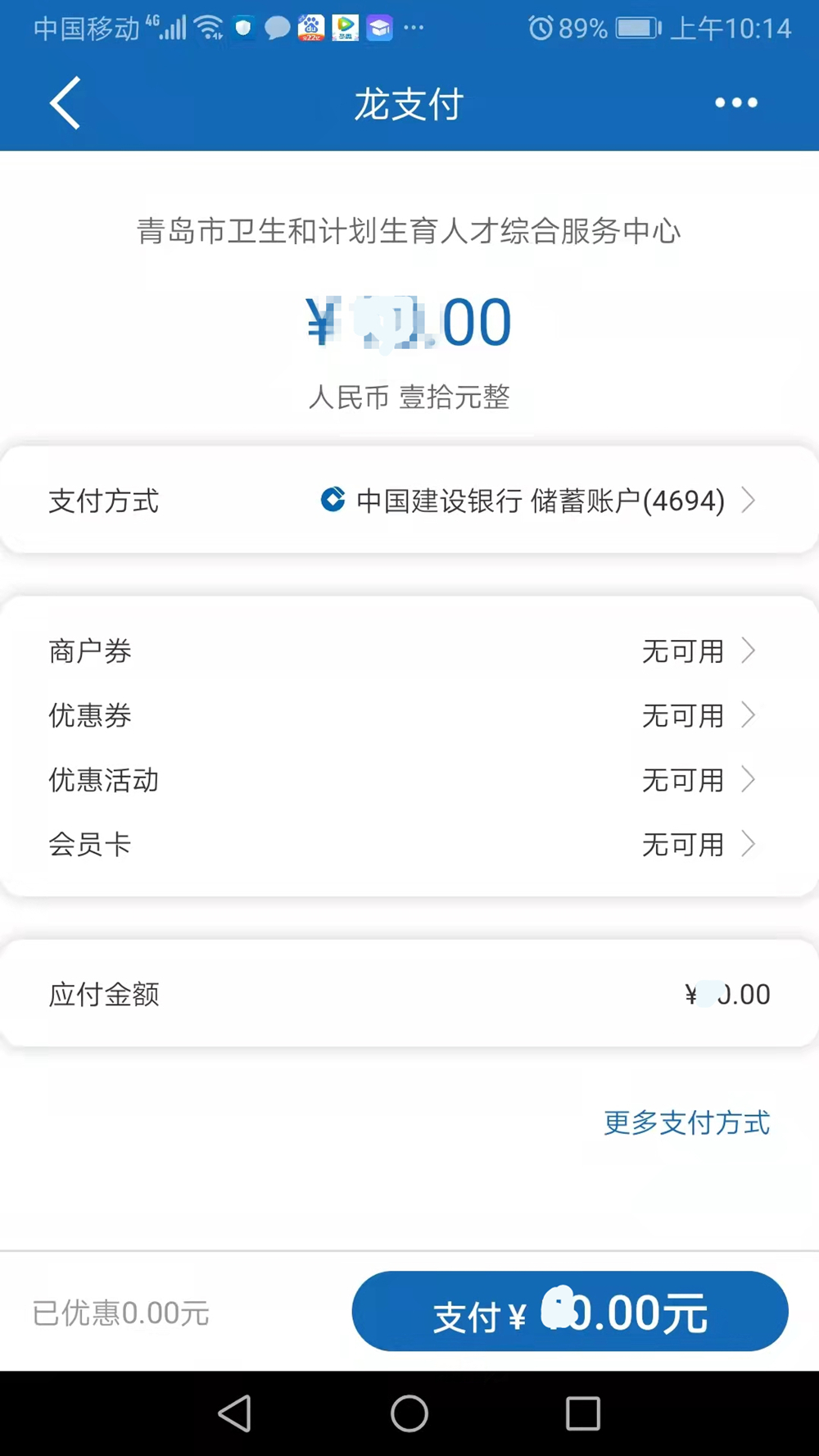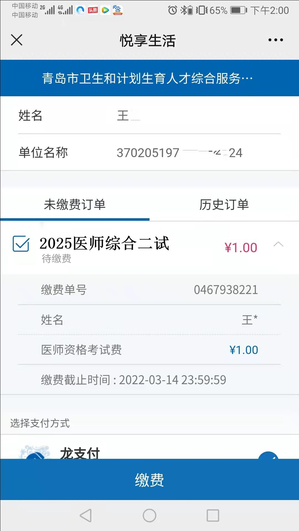 查詢繳費(fèi)單時,單位名稱欄目請?zhí)睢白C件號碼”,以居民身份證報考的考生請?zhí)顚懮矸葑C號,以其他證件報考的考生請?zhí)顚憟罂紩r所提交的相應(yīng)證件的號碼。青島考點(diǎn)考生繳費(fèi)成功后可在建設(shè)銀行“云平臺”查到繳費(fèi)記錄,國家醫(yī)學(xué)考試網(wǎng)不提供繳費(fèi)查詢服務(wù)。