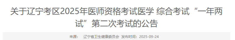 按照《國家衛(wèi)生健康委醫(yī)師資格考試委員會辦公室關(guān)于2025年醫(yī)師資格考試醫(yī)學(xué)綜合考試“一年兩試”工作的通知》(國衛(wèi)醫(yī)考委辦發(fā)〔2025〕5號)要求,現(xiàn)將遼寧考區(qū)2025年醫(yī)師資格考試醫(yī)學(xué)綜合考試“一年兩試”第二次考試有關(guān)事宜公告如下: