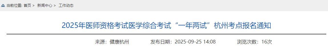 根據(jù)浙江省醫(yī)師資格考試領(lǐng)導(dǎo)小組辦公室《關(guān)于開展2025年醫(yī)師資格考試醫(yī)學(xué)綜合考試“一年兩試”工作的通知》的規(guī)定,杭州考點(diǎn)將繼續(xù)參加2025年醫(yī)師資格考試醫(yī)學(xué)綜合考試“一年兩試”工作?,F(xiàn)就有關(guān)事項(xiàng)通知如下: