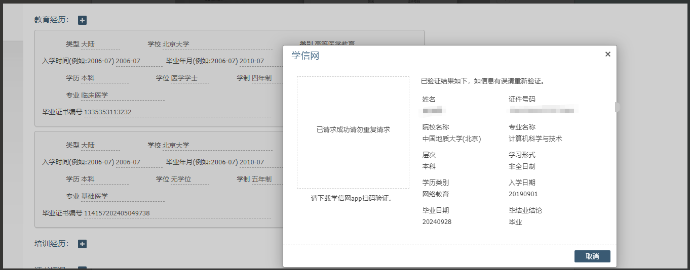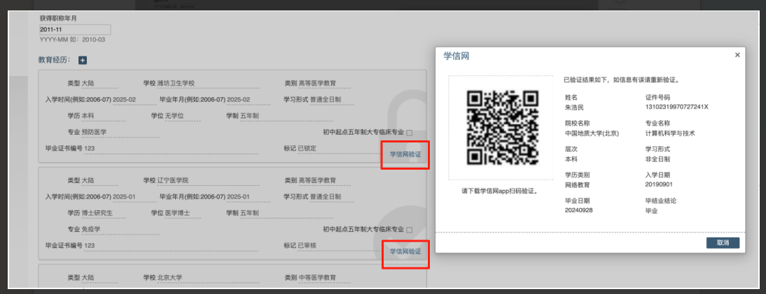 注意:如有多個(gè)學(xué)歷,APP上選擇的學(xué)歷應(yīng)與掃碼學(xué)歷保持一致。若對應(yīng)錯(cuò)誤,可重新掃碼驗(yàn)證進(jìn)行更正。