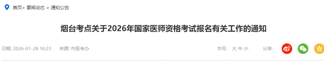 根據(jù)《國(guó)家衛(wèi)生健康委員會(huì)醫(yī)師資格考試委員會(huì)公告》(2026年第1號(hào))和山東考區(qū)有關(guān)工作安排,現(xiàn)將2026年國(guó)家醫(yī)師資格考試煙臺(tái)考點(diǎn)報(bào)名工作有關(guān)事項(xiàng)公告如下: