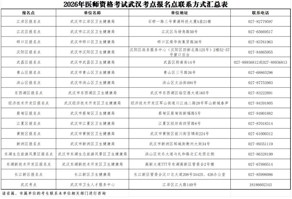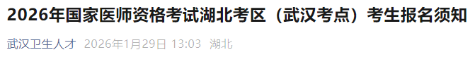 根據(jù)《中華人民共和國醫(yī)師法》、《醫(yī)師資格考試暫行辦法》規(guī)定和《國家衛(wèi)生健康委員會醫(yī)師資格考試委員會公告》(2026年第1號)精神,結(jié)合湖北考區(qū)武漢考點實際,現(xiàn)將2026年國家醫(yī)師資格考試有關(guān)事項通知如下: