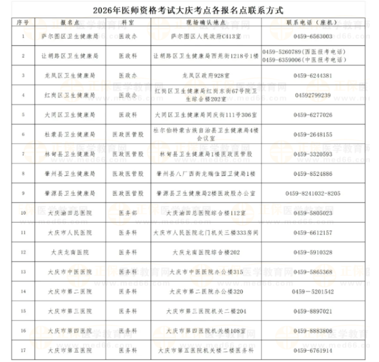 根據(jù)黑龍江省醫(yī)師資格考試委員會(huì)辦公室《關(guān)于做好黑龍江考區(qū)2026年醫(yī)師資格考試報(bào)名工作的通知》(黑醫(yī)考辦發(fā)〔2026〕2號(hào))文件要求,現(xiàn)將大慶考點(diǎn)2026年醫(yī)師資格考試報(bào)名工作有關(guān)要求公告如下: