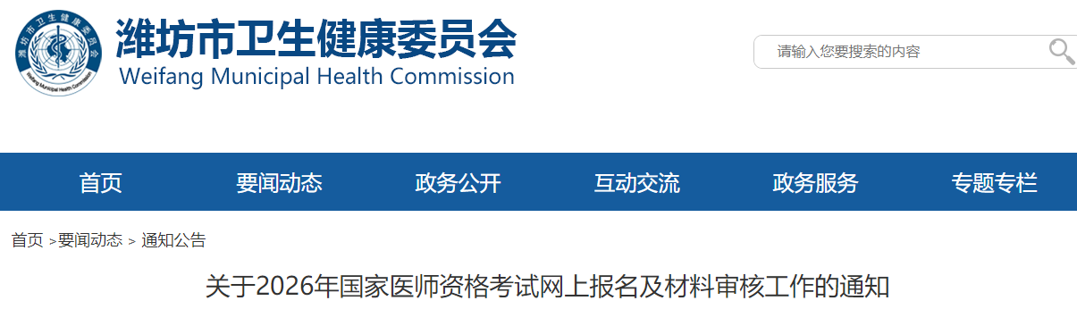 根據(jù)《國(guó)家衛(wèi)生健康委員會(huì)醫(yī)師資格考試委員會(huì)公告》(2026年第1號(hào))和《2026年度醫(yī)師資格考試山東考區(qū)考試通告》要求,為做好我市2026年國(guó)家醫(yī)師資格考試考生網(wǎng)上報(bào)名及材料審核工作,現(xiàn)將有關(guān)事項(xiàng)通知如下。