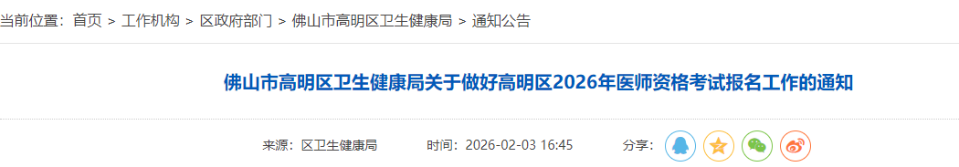(3)我局根據(jù)上級(jí)主管部門文件和要求整理制定了《佛山市高明區(qū)2026年醫(yī)師資格考試報(bào)名相關(guān)要求》(附件1)供各單位的考生閱讀并指導(dǎo)考生按照要求報(bào)名。