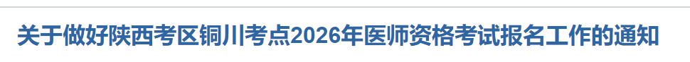 按照國家衛(wèi)生健康委醫(yī)師資格考試委員會《公告》(2026年第1號)和陜西省衛(wèi)生健康委醫(yī)師資格考試領(lǐng)導(dǎo)小組辦公室公告要求,現(xiàn)就2026年醫(yī)師資格考試陜西考區(qū)銅川考點(diǎn)報名和資格審核有關(guān)事項(xiàng)通知如下: