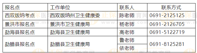 2026年度考試按照行政區(qū)劃分設(shè)州直、景洪市、勐??h、勐臘縣4個(gè)報(bào)名點(diǎn)。其中,州衛(wèi)生健康委宣傳科教科(州直報(bào)名點(diǎn))負(fù)責(zé)州直醫(yī)療衛(wèi)生單位、景洪市第一人民醫(yī)院考生線上審核及軍隊(duì)現(xiàn)役考生現(xiàn)場審核和相關(guān)材料收集工作,各縣(市)衛(wèi)生健康局負(fù)責(zé)轄區(qū)內(nèi)醫(yī)療衛(wèi)生單位(含民營醫(yī)療機(jī)構(gòu))及計(jì)生服務(wù)機(jī)構(gòu)考生線上初審及相關(guān)材料收集工作。各報(bào)名點(diǎn)聯(lián)系方式如下: