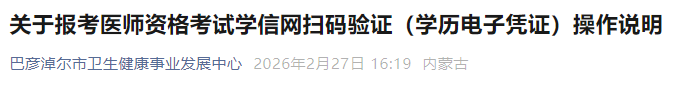 內(nèi)蒙古巴彥淖爾2026年醫(yī)師資格考試學(xué)信網(wǎng)驗(yàn)證開始!請(qǐng)之前沒(méi)有完成學(xué)信網(wǎng)驗(yàn)證的考生盡快掃碼驗(yàn)證,避免影響報(bào)考!