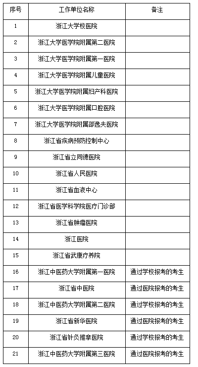 6、考生的工作單位根據(jù)國(guó)家醫(yī)學(xué)考試中心報(bào)名軟件提供的名錄,選擇所在試用單位;醫(yī)院下面設(shè)有分院或其他院區(qū)的,必須統(tǒng)一選擇主體醫(yī)院的名稱。因單位名稱填寫不規(guī)范引起的信息數(shù)據(jù)丟失,后果由考生自負(fù)。目前通過(guò)本考點(diǎn)報(bào)考的工作單位名單羅列如下(試用單位在浙江中醫(yī)藥大學(xué)3家附屬醫(yī)院的考生,為了區(qū)別考生身份,填報(bào)要求按表格備注欄選擇填寫):