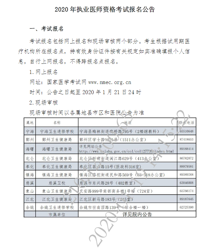 浙江寧波2020年醫(yī)師資格現(xiàn)場確認審核時間、地點及材料等事項通知