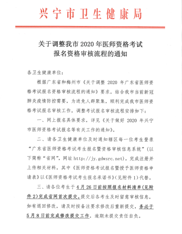 廣東興寧市關(guān)于調(diào)整2020年醫(yī)師資格考試報(bào)名資格審核流程的通知