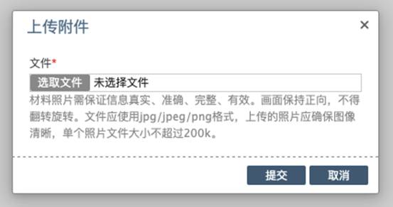 材料照片需保證信息真實(shí)、準(zhǔn)確、完整、有效。畫面保持正向,不得翻轉(zhuǎn)旋轉(zhuǎn)。文件應(yīng)使用jpg/jpeg/png格式,上傳的照片應(yīng)確保圖像清晰,單個(gè)照片文件大小不超過200k。