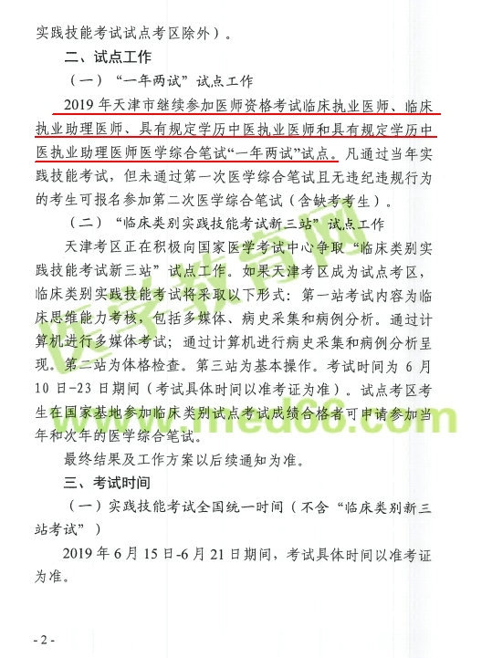 天津市發(fā)布關(guān)于做好2019年醫(yī)師資格考試天津考區(qū)報(bào)名工作的通知,根據(jù)通知內(nèi)容:2019年天津市繼續(xù)開展醫(yī)師資格“一年兩試”試點(diǎn)工作,具體內(nèi)容醫(yī)學(xué)教育網(wǎng)小編為大家整理如下: