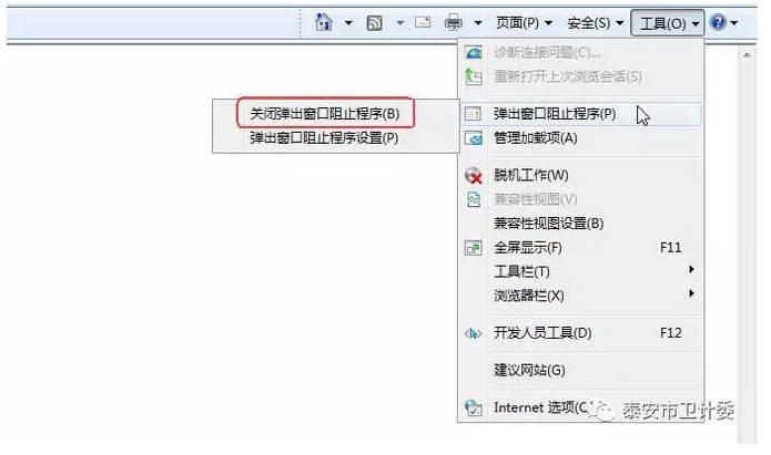 在菜單中選擇“工具->彈出窗口阻止程序”,如果二級菜單顯示“關閉彈出窗口阻止程序”,則點擊此菜單。如下圖: