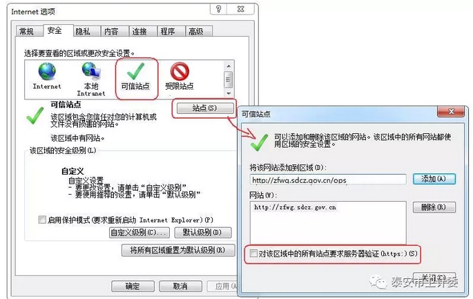 2. 在“將該網(wǎng)站添加到區(qū)域”欄輸入“http://zfwg.sdcz.gov.cn/ops”,點“添加”按鈕。