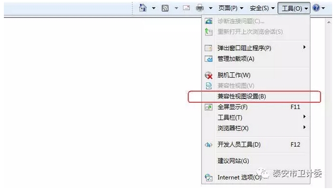 在菜單中選擇“工具->兼容性視圖設置”,如下圖: