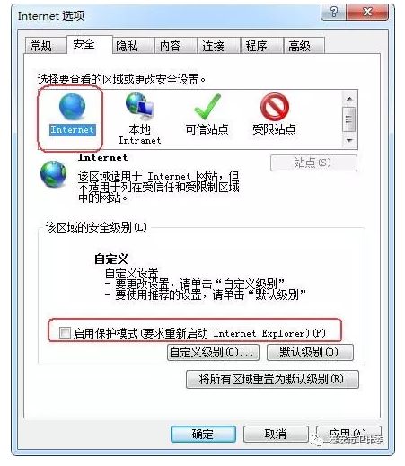 2. 選擇“安全”TAB頁,點擊“Internet”,去掉“啟用保護模式”選項的對號,點“應用”按鈕,如下圖: