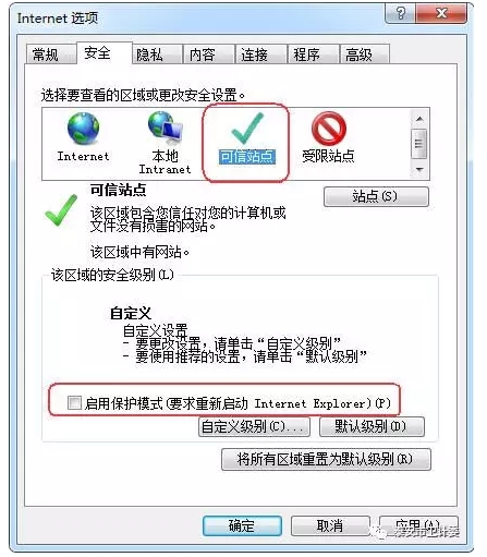 3. 選擇“安全”TAB頁,點擊“可信站點”,去掉“啟用保護模式”選項的對號,點“應用”按鈕,如下圖: