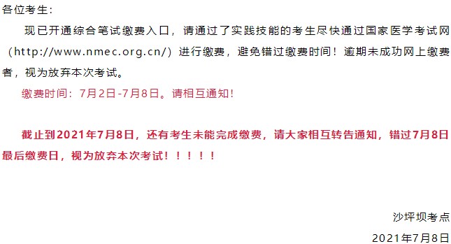 緊急通知!沙坪壩考點(diǎn)2021年醫(yī)師資格綜合筆試考試?yán)U費(fèi)通知發(fā)布,今天是醫(yī)師繳費(fèi)最后一天,繳費(fèi)入口即將關(guān)閉!請(qǐng)未繳費(fèi)的考生及時(shí)登錄國(guó)家醫(yī)學(xué)考試中心網(wǎng)站繳費(fèi)!錯(cuò)過7月8日最后繳費(fèi)日,視為放棄本次考試!下面是沙坪壩考點(diǎn)繳費(fèi)通知。