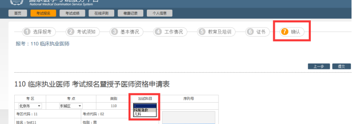 答:報考臨床執(zhí)業(yè)醫(yī)師且在院前急救或兒科崗位的考生可以申請參加短線醫(yī)學(xué)專業(yè)加試,網(wǎng)上填報時,在報名的第七步確認(rèn)時,在表中選院前急救或兒科加試。參加短線醫(yī)學(xué)專業(yè)加試的考生,如通過加試獲得醫(yī)師資格,限定在加試的專業(yè)或崗位范圍內(nèi)執(zhí)業(yè),如需變更執(zhí)業(yè)范圍需重新參加醫(yī)師資格考試獲取醫(yī)師資格。如下圖: