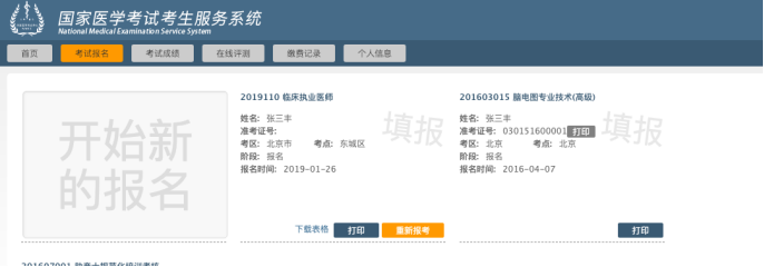答:如需修改個人報名信息,須在網(wǎng)上報名截止日前,再次登陸服務(wù)平臺,進(jìn)入“考試報名”欄目,在需要修改的報名下方點擊“重新報考”,然后再重新報名,報名成功后需重新打印《醫(yī)師資格考試報名暨授予醫(yī)師資格申請表》。如下圖: