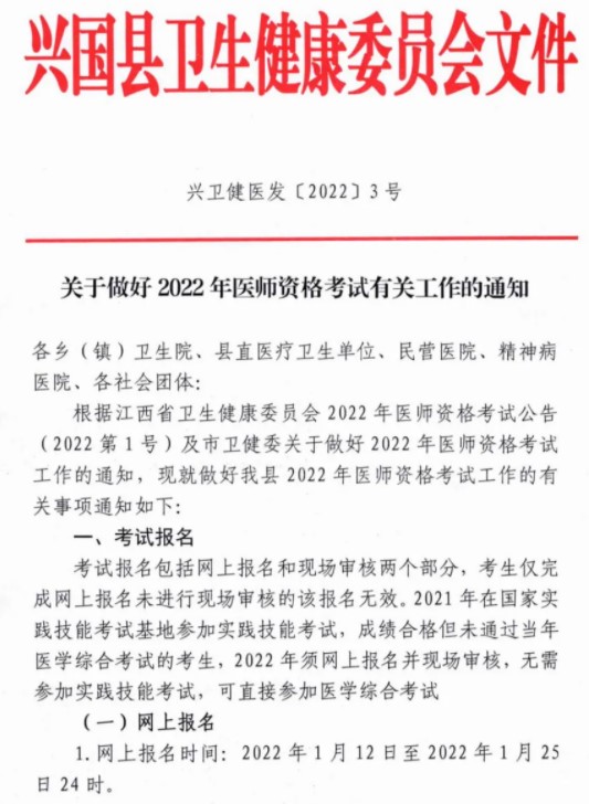 江西省贛州市興國縣2022年醫(yī)師資格考試報(bào)名相關(guān)工作的通知