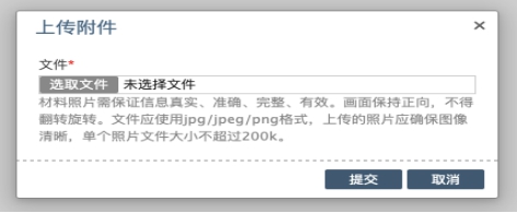 材料照片需保證信息真實、準確、完整、有效。畫面保持正向,不得翻轉(zhuǎn)旋轉(zhuǎn)。文件應(yīng)使用jpg/jpeg/png格式,上傳的照片應(yīng)確保圖像清晰,單個照片文件大小不超過200k。