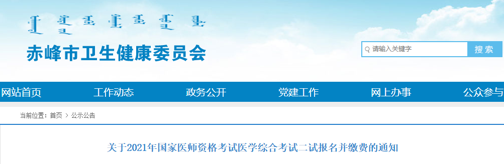 內(nèi)蒙古赤峰考點(diǎn)2021年國家醫(yī)師資格考試醫(yī)學(xué)綜合考試二試報(bào)名并繳費(fèi)的通知