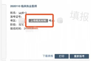 考生按常規(guī)報(bào)名流程進(jìn)入國家醫(yī)學(xué)考試考生系統(tǒng),查看自己的報(bào)名信息,在報(bào)名信息處,點(diǎn)擊“上傳相關(guān)材料”按鈕,按頁面提示進(jìn)入報(bào)名材料上傳界面。