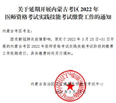關(guān)于延期開展內(nèi)蒙古考區(qū)2022年醫(yī)師資格考試實(shí)踐技能考試?yán)U費(fèi)工作的通知