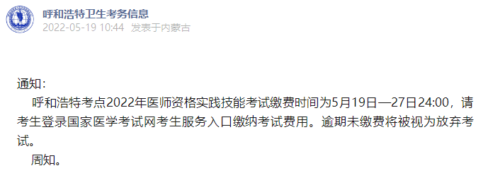 呼和浩特考點2022年醫(yī)師資格實踐技能考試繳費時間為5月19日—27日24:00,請考生登錄國家醫(yī)學考試網(wǎng)考生服務(wù)入口繳納考試費用。逾期未繳費將被視為放棄考試。