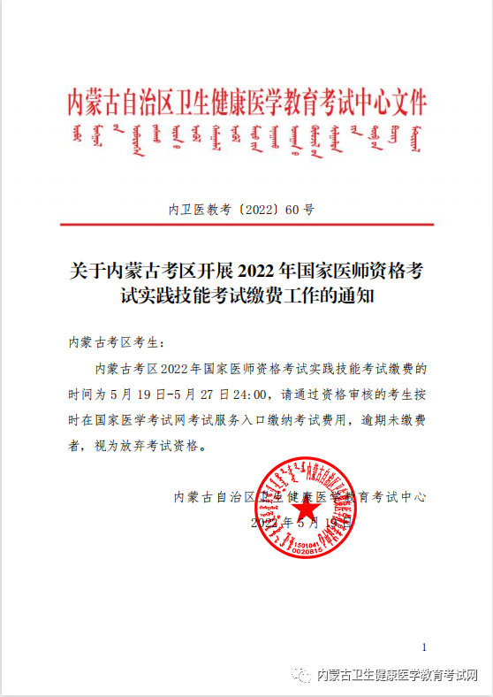 關(guān)于內(nèi)蒙古考區(qū)開展2022年國(guó)家醫(yī)師資格考試實(shí)踐技能考試?yán)U費(fèi)工作的通知