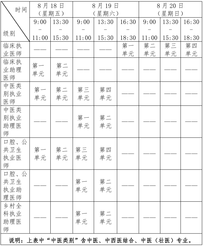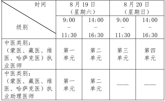 考試實(shí)行計(jì)算機(jī)化考試,軍隊(duì)現(xiàn)役人員加試軍事醫(yī)學(xué)、院前急救崗位和兒科專業(yè)加試相應(yīng)內(nèi)容。中醫(yī)類別蒙醫(yī)、藏醫(yī)、維醫(yī)、哈薩克醫(yī)專業(yè)實(shí)行紙筆考試。統(tǒng)一考試時(shí)間如下: